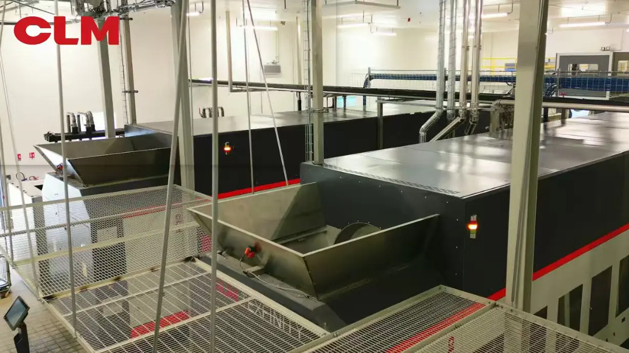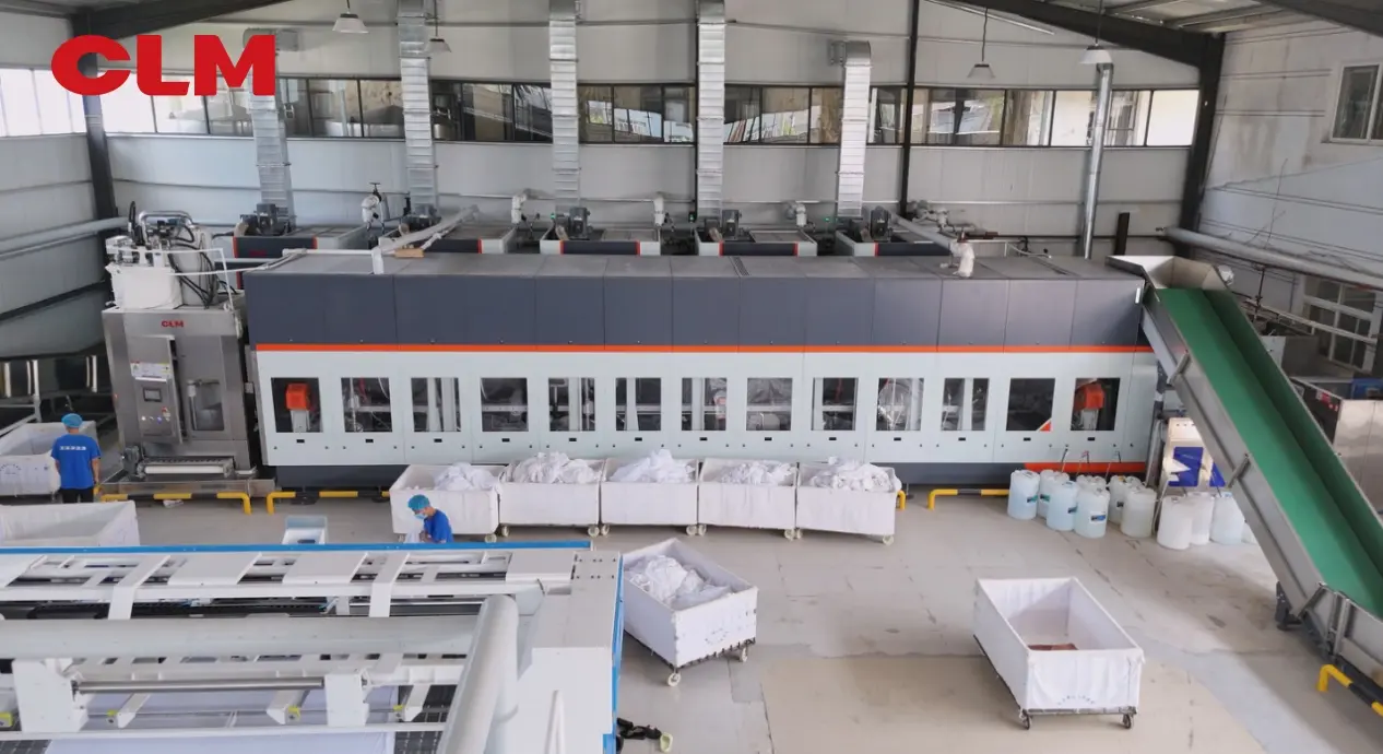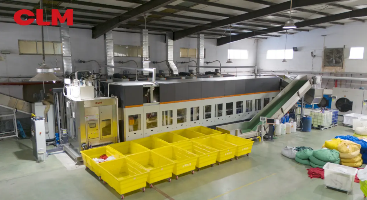 Este sistema está compuesto por transportador de carga, lavadoras industriales en túnel, prensa, transportadores lanzadera, secadoras de tumble, colectores de pelusas y sistemas de control.